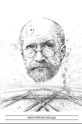 À l’occasion de l’adoption par les Nations unies de la Convention internationale des droits de l’enfant fin 1989 et de sa ratification par la France en 1990, l’Association Korczak (AFJK), a produit, avec l’aide du grand peintre polonais W. Siudmak, une affiche et une série de deux cartes postales destinées à communiquer le message de Janusz Korczak.- L’affiche et l’une des deux cartes représentaient un superbe portrait dit de Janusz Korczak, dessiné au trait avec des enfants plein la tête sur un fond de rails de chemin de fer en étoile évoquant son dernier trajet vers Treblinka. Le visage représenté n’est pas celui du grand éducateur mais celui de l’acteur polonais Pszoniak qui l’incarne dans le film de Wajda Korczak, sorti la même année (1990).