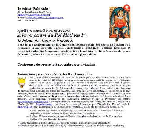 L’Association Française Janusz Korczak (AFJK) et l’Institut Polonais de Paris ont organisé pour la première fois trois belles journées d’animation pour les enfants autour du roman pour enfants de Janusz Korczak, Le roi Mathias Ier, avec conférence de presse, invitation officielle des enfants des écoles et des centres de loisirs parisiens et soirée débat. Claire Brisset, la Défenseure des enfants, nous avait fait l'honneur de sa présence.