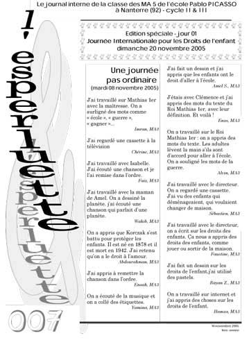 anniversaire de ce lieu d'accueil pilote, dont le succès commence à faire école ;- Le mercredi 29 novembre : accueil d'une cinquantaine d'élèves de l'École primaire Pablo Picasso de Nanterre. Les deux classes concernées avaient déjà commencé à travailler autour du roman de Janusz Korczak. Avec le soutien financier de la Mairie de Nanterre, un projet Théâtre a vu le jour qui les a permis de réaliser leur propre adaptation théâtrale du petit roi Mathias au mois de juin 2006. L'Association Korczak était déjà intervenue trois fois dans l'école l'année précédente.