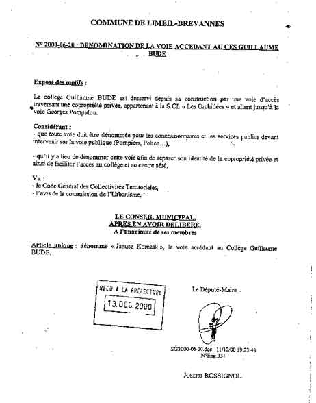 - Le 24 novembre 2000, le Conseil municipal de Limeil-Brévannes a choisi de donner le nom de « rue Janusz Korczak » à cette voie nouvelle menant au Collège Guillaume Budé, l’un des deux collèges de la ville. (cf. extrait du registre visé par la Préfecture le 13 décembre 2000)