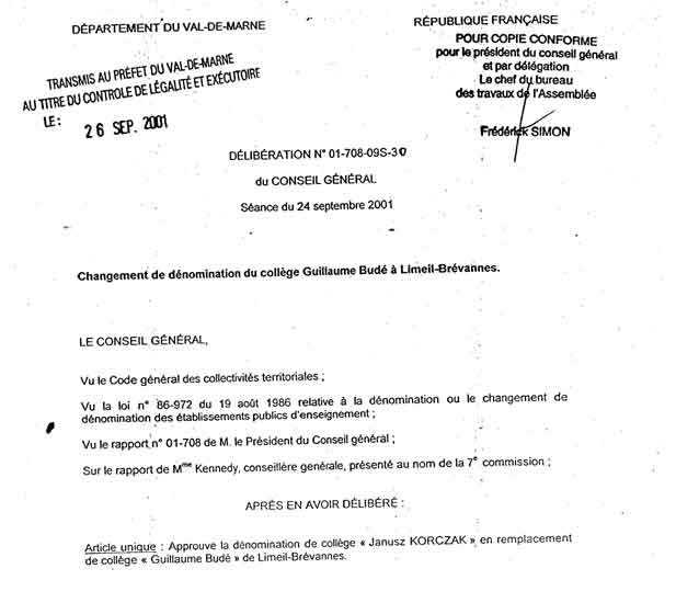 - Le 24 septembre 2001, le Conseil Général du Val-de-Marne a approuvé la nouvelle dénomination de « Collège Janusz Korczak », en remplacement de « Collège Guillaume Budé » situé au 45 avenue de Valenton. On lira ici la délibération du Conseil Général.