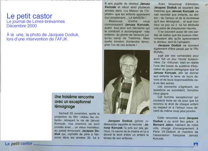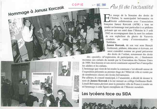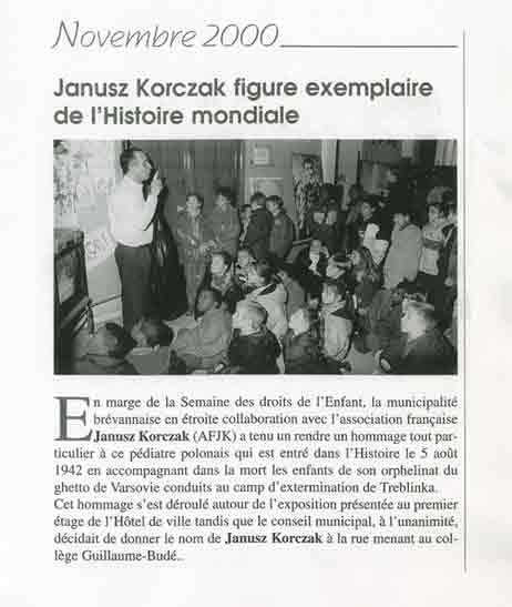 - Au mois de novembre 2000, l’AFJK a été invitée à intervenir dans le cadre de la Journée nationale des droits de l’enfant. Nous avions présenté l’exposition Korczak de l’INRP dans la mairie et organisé une conférence-débat et projection de film avec Jacques Dodiuk, ancien pupille de Korczak, Bernard Jabin représentant l'AFJK, et le professeur Jean Houssaye. Ces événements avaient suscité un certain intérêt et le public était venu nombreux (cf. le bulletin n° 13 de l’association et les articles du Petit Castor, le journal municipal).