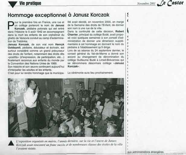 Le nom de JANUSZ KORCZAK a été donné à une rue et à un collège de la ville de LIMEIL-BRÉVANNES (Val-de-Marne). La presse lovcal s'en est fait l'écho.